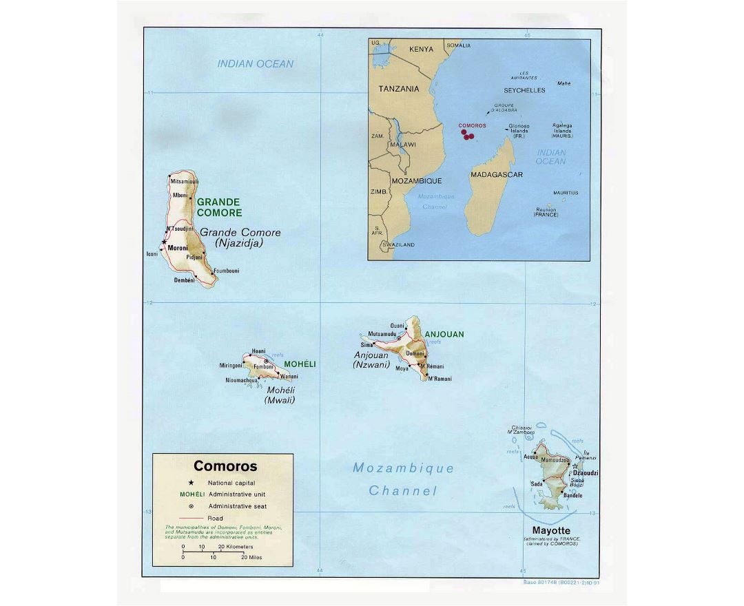 Официальные языки — коморский (родственный языку суахили), французский и арабский. Государственная религия — ислам.