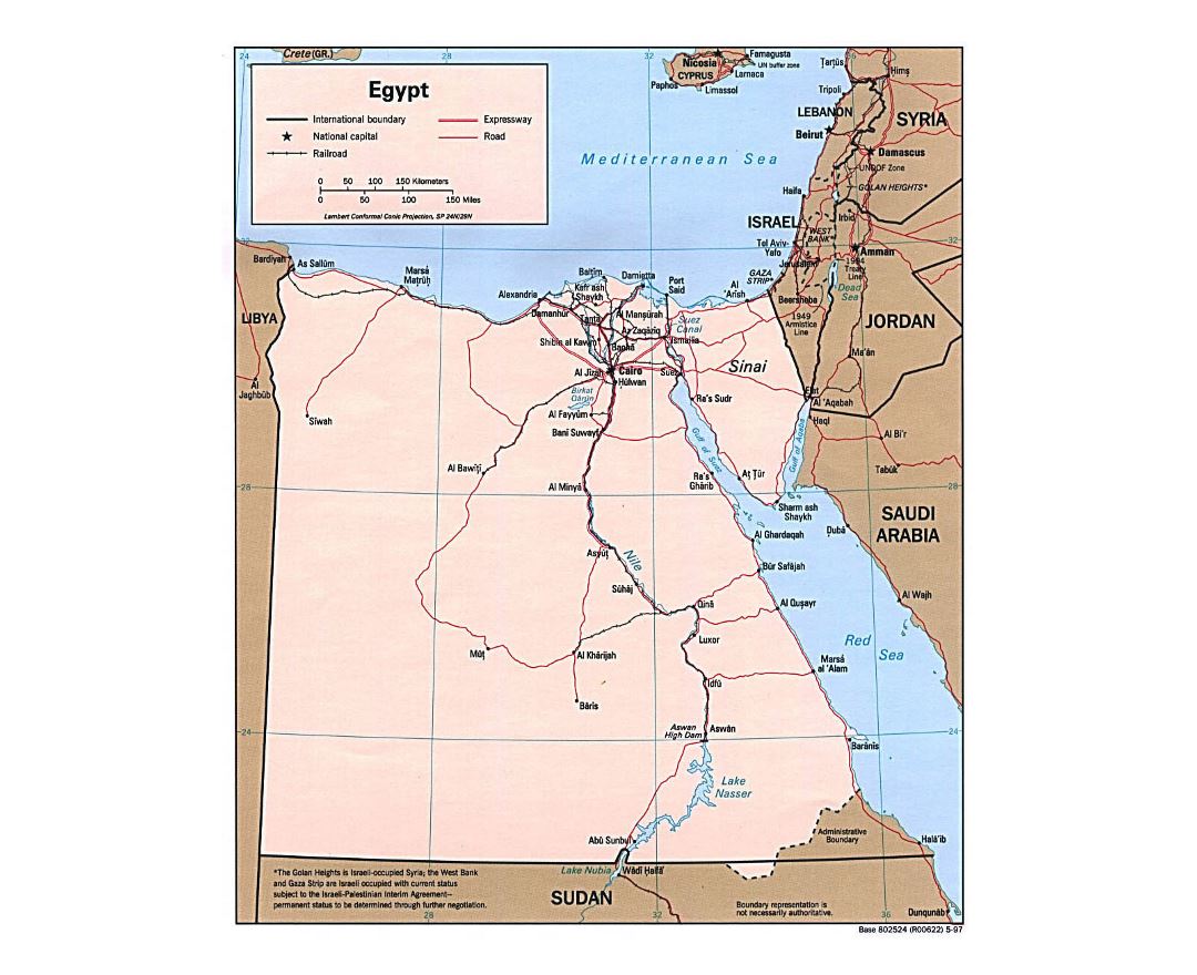На северо-востоке граничит с Израилем, Сектором Газа. На юге с Суданом. На западе с Ливией. На севере территория омывается водами Средиземного, на востоке — Красного морей. Оба моря соединены посредством искусственно сооружённого Суэцкого канала.