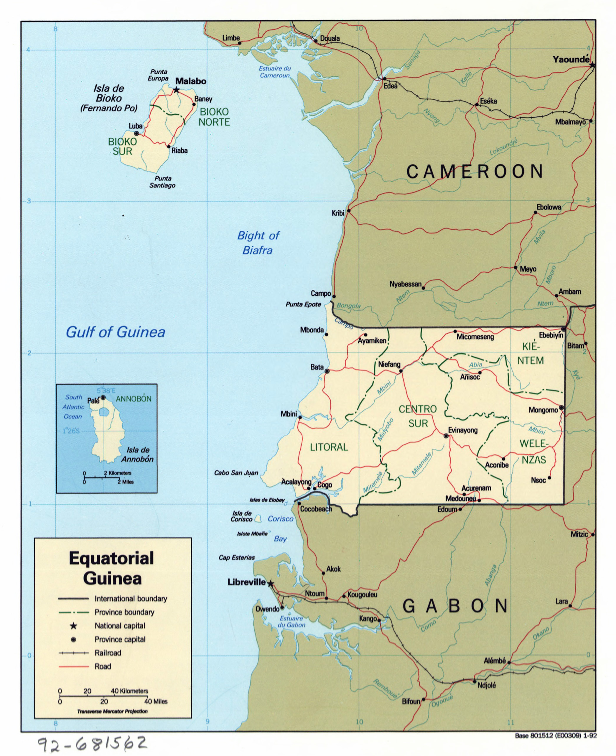 Экваториальная Гвинея - большая детальная политическая и административная карта с дорогами, железными дорогами и крупными городами - 1992. Политическая и административная карта Экваториальной Гвинеи с дорогами, железными дорогами и крупными городами.
