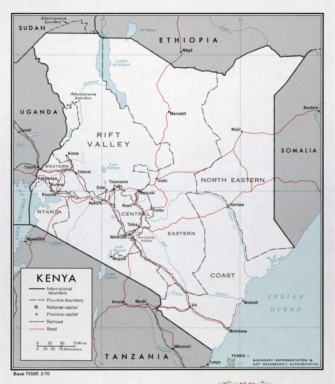Кения - большая детальная политическая и административная карта с дорогами, железными дорогами и крупными городами - 1970. Большая детальная политическая и административная карта Кении с дорогами, железными дорогами и крупными городами - 1970.