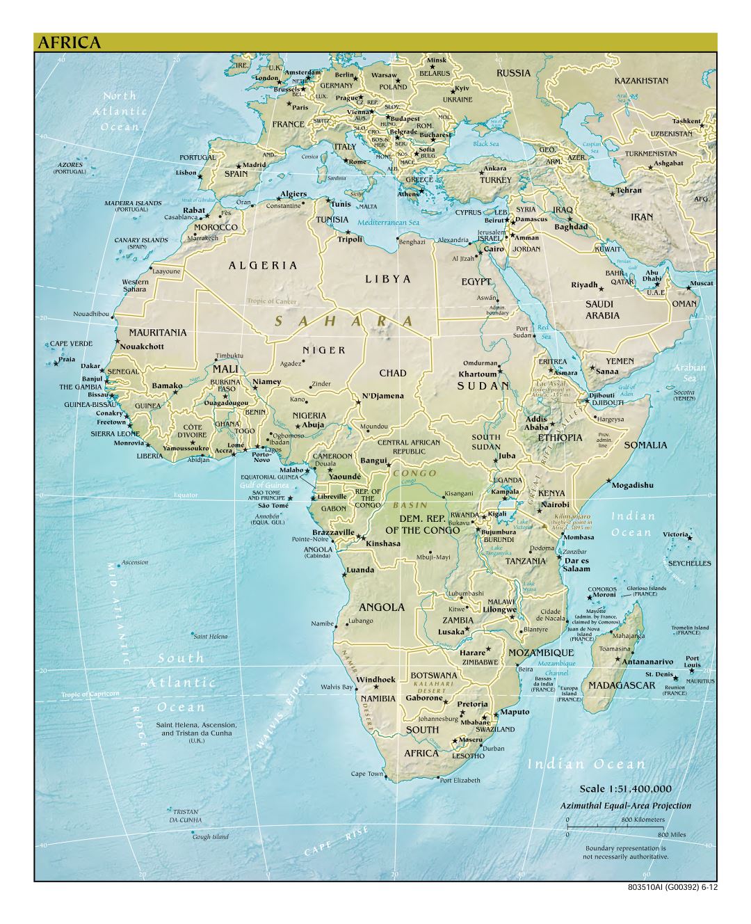Большая подробная политическая карта Африки с рельефом, крупными городами и столицами - 2012. Политическая карта Африки с рельефом.
