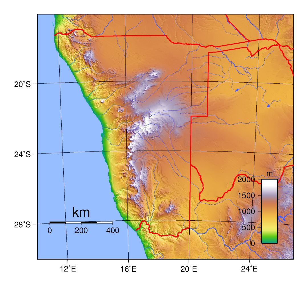 Намибия - большая физическая карта. Большая физическая карта Намибии.