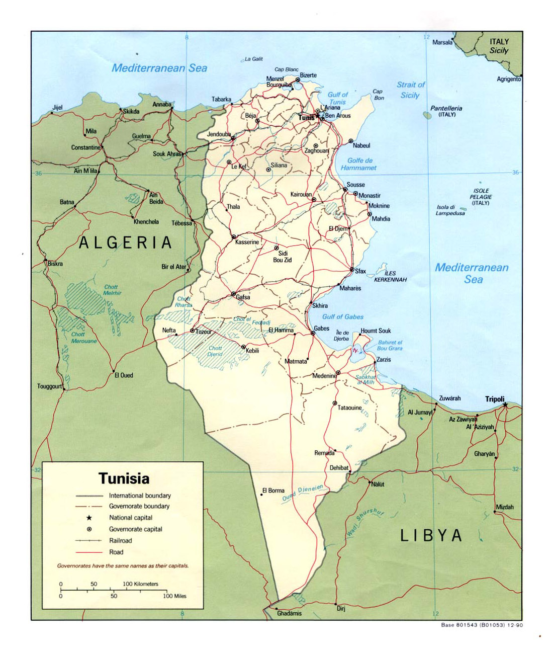 Тунис - детальная политическая и административная карта с дорогами, железными дорогами и крупными городами - 1990. Детальная политическая и административная карта Туниса с дорогами, железными дорогами и крупными городами - 1990.