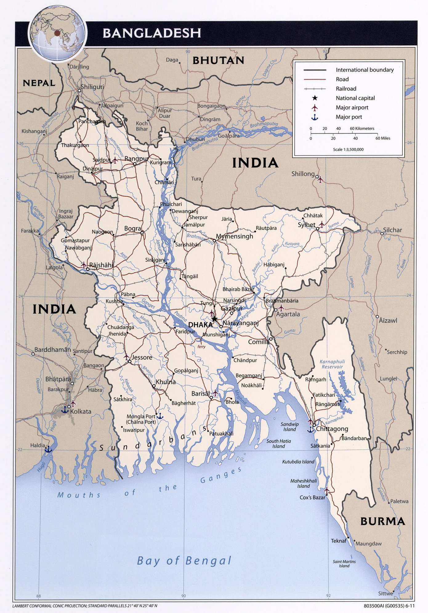 Бангладеш - большая детальная политическая карта с дорогами, железными дорогами, крупными городами и аэропортами - 2011. Политическая карта Бангладеш с дорогами, железными дорогами, крупными городами и аэропортами - 2011.