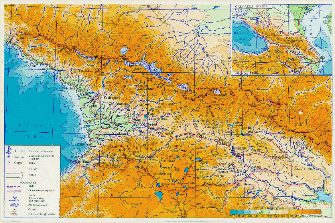 Грузия - детальная физическая карта с дорогами и городами. Детальная физическая карта Грузии с дорогами и городами.