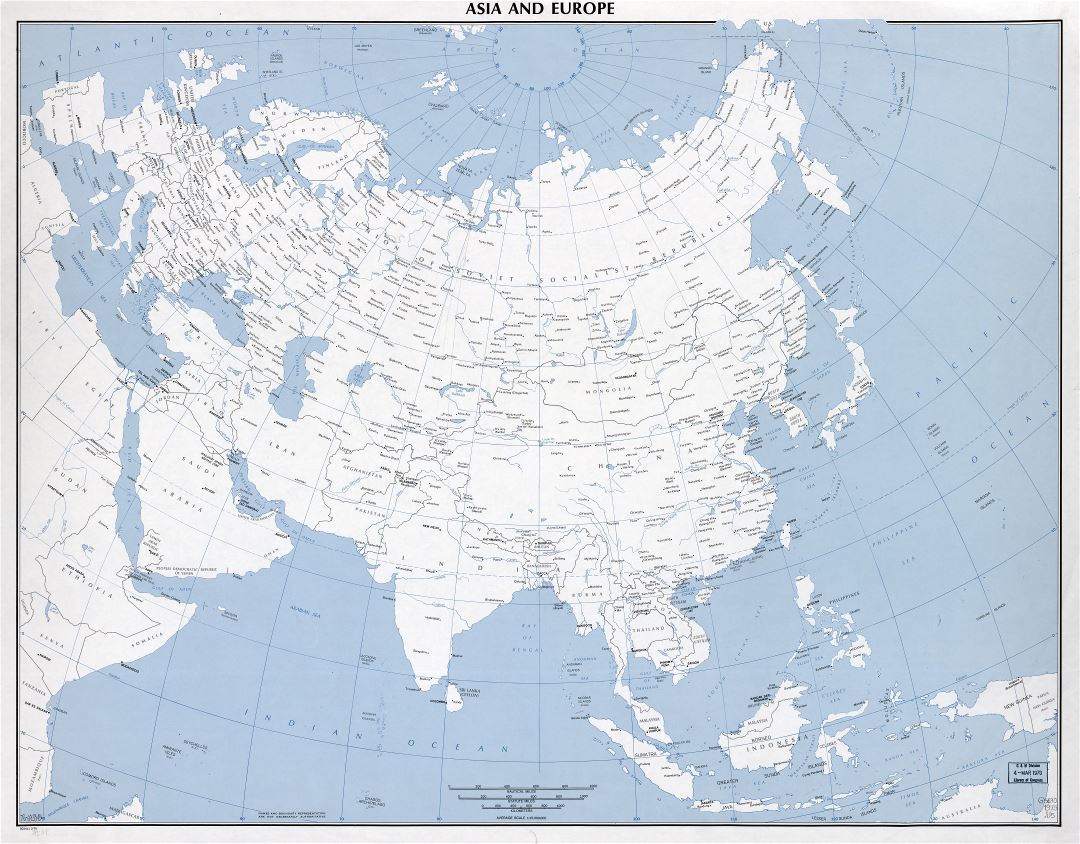 Азия, Европа - детальная политическая карта 1975 года с крупными городами в большом формате. Крупномасштабная политическая карта Азии и Европы с крупными городами - 1975.