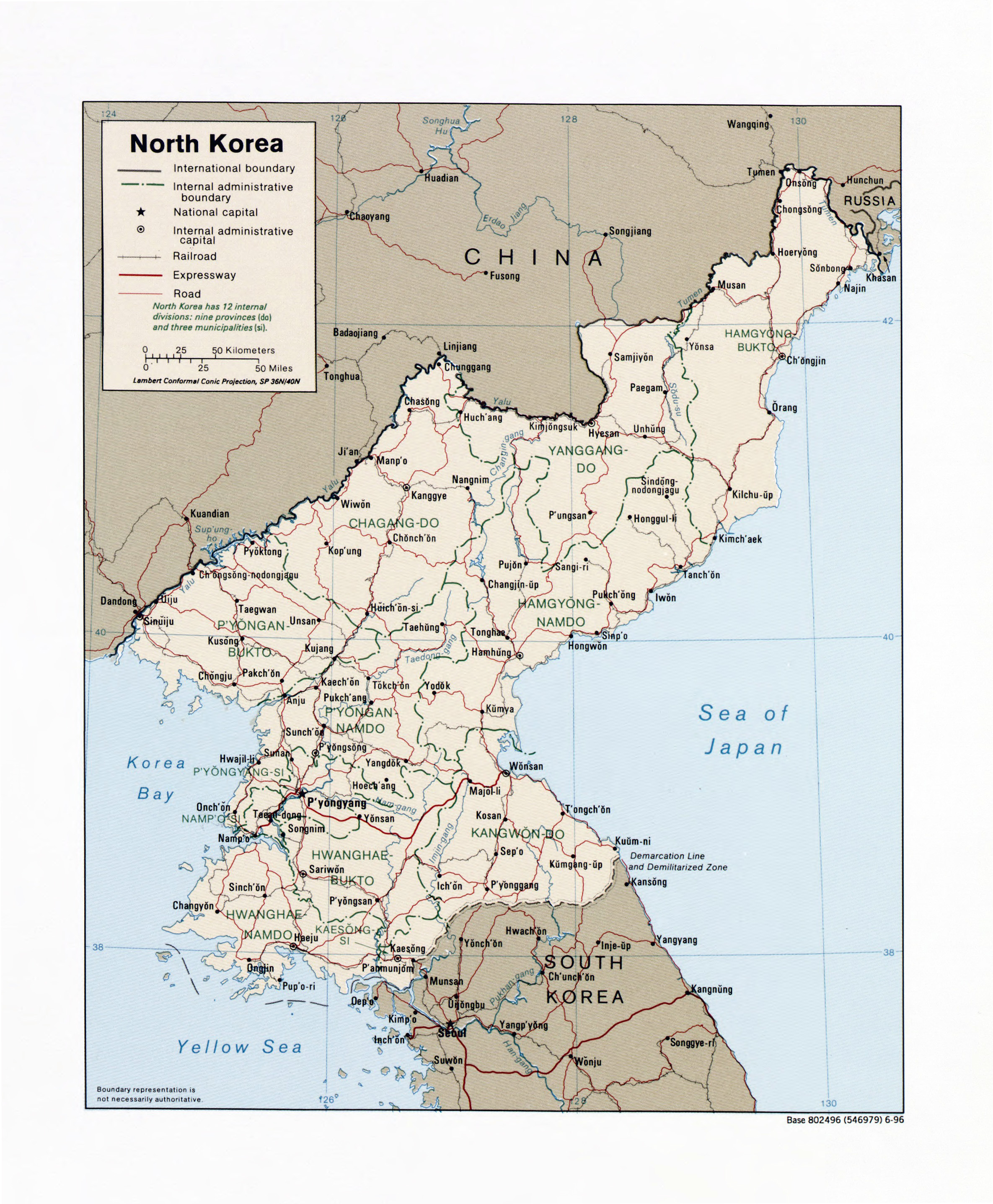 Северная Корея - большая детальная политическая и административная карта с дорогами, железными дорогами и крупными городами - 1996. Политическая и административная карта Северной Кореи с дорогами, железными дорогами и крупными городами.