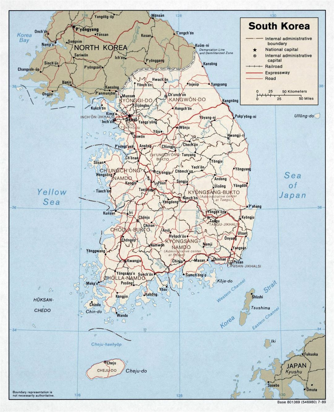 Южная Корея - большая политическая и административная карта с дорогами, железными дорогами и крупными городами - 1989. Политическая и административная карта Южной Кореи с дорогами, железными дорогами и крупными городами - 1989.