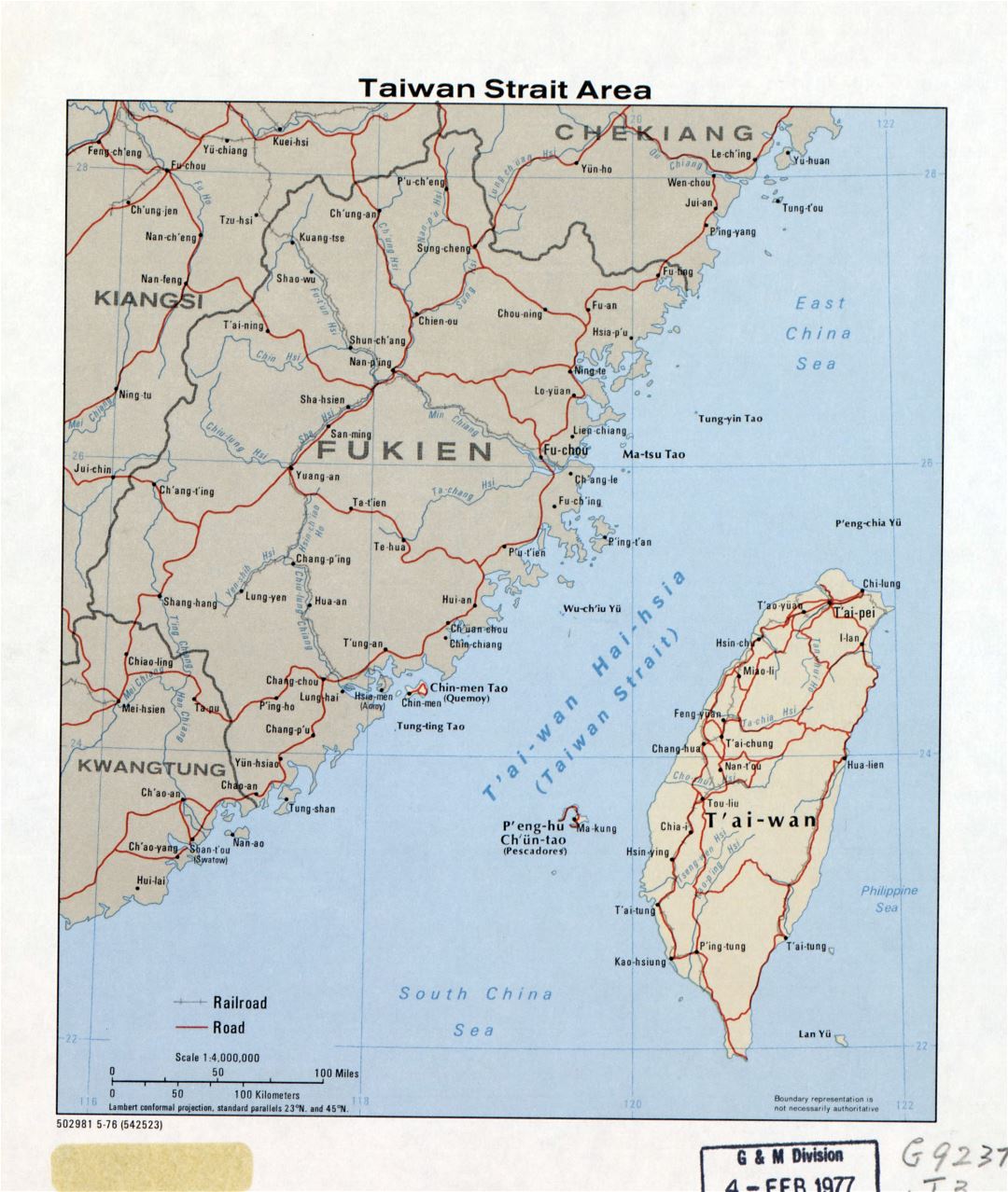 Большая детальная карта района Тайваньского пролива с дорогами, железными дорогами и крупными городами - 1976