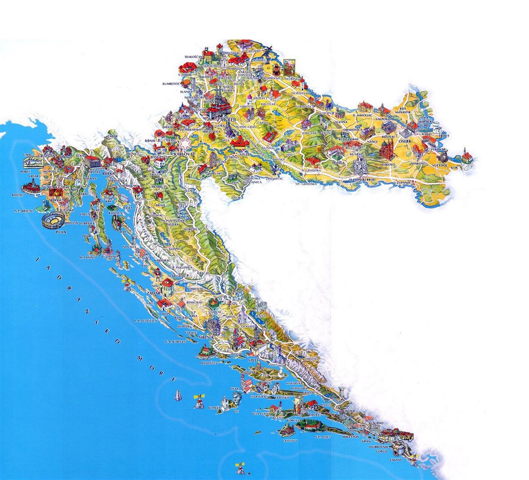 Хорватия - большая туристическая иллюстрированная карта. Большая туристическая иллюстрированная карта Хорватии.