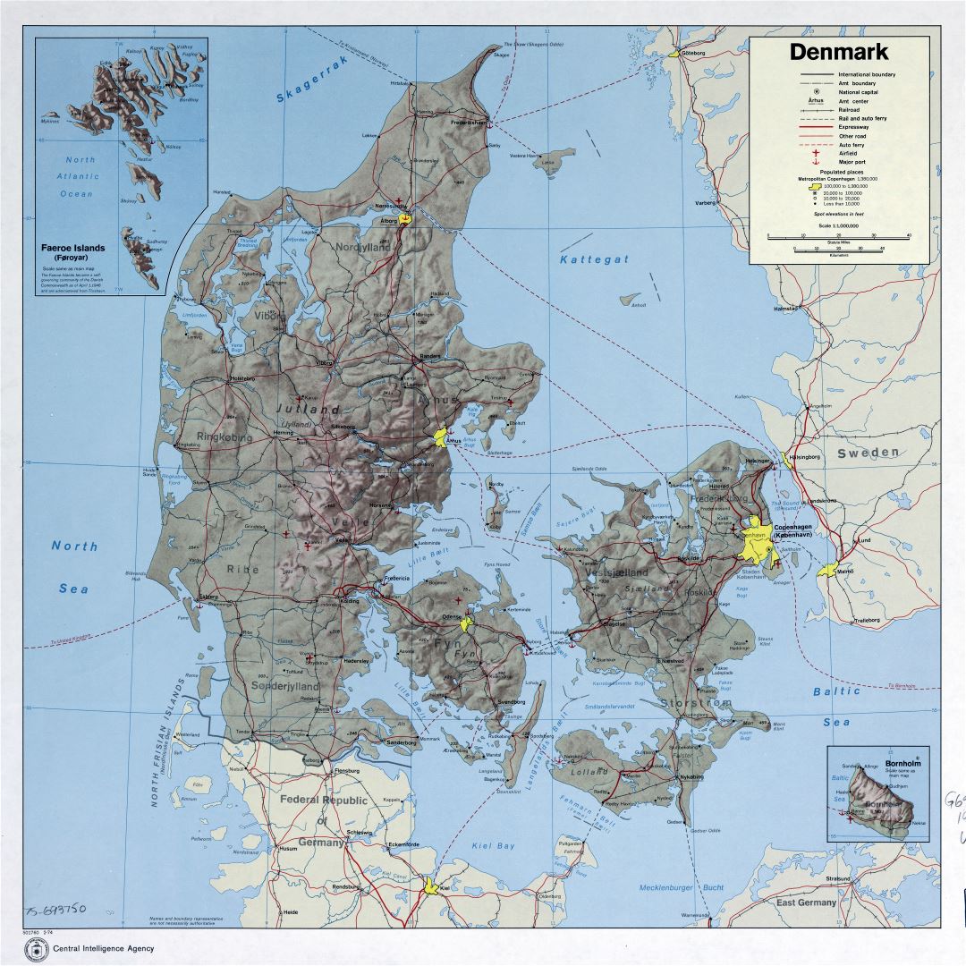 Дания - крупномасштабная политическая и административная карта с рельефом, дорогами, железными дорогами, аэропортами, портами и городами - 1974. Политическая и административная карта Дании.