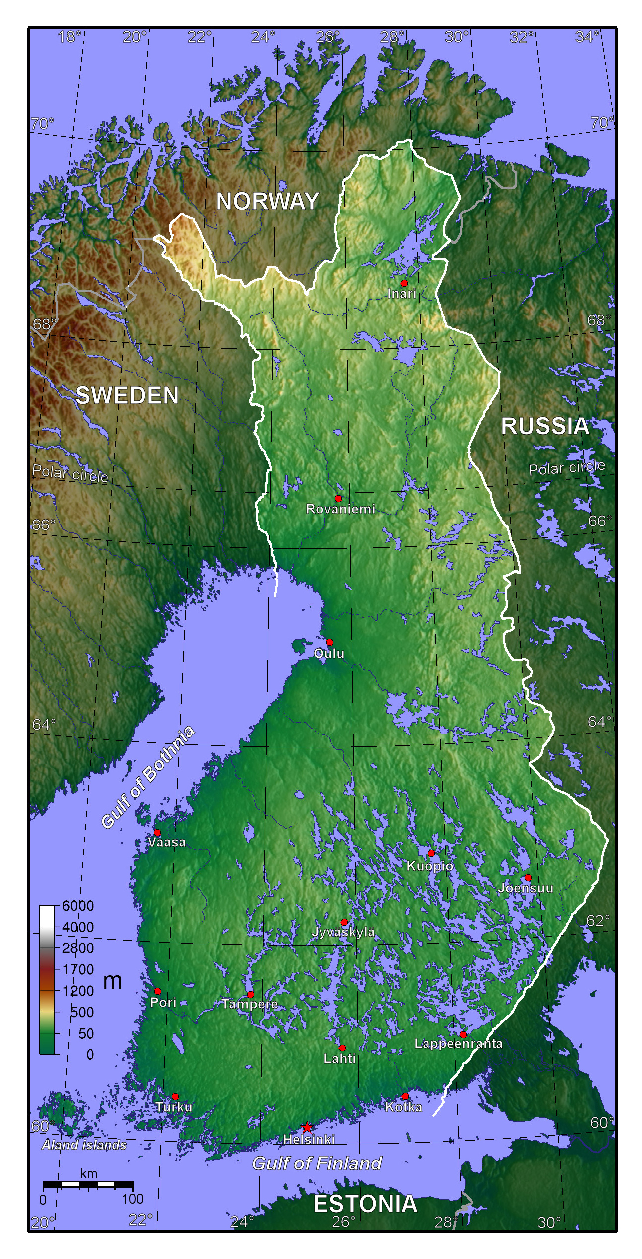 Финляндия - большая детальная физическая карта. Большая детальная физическая карта Финляндии.