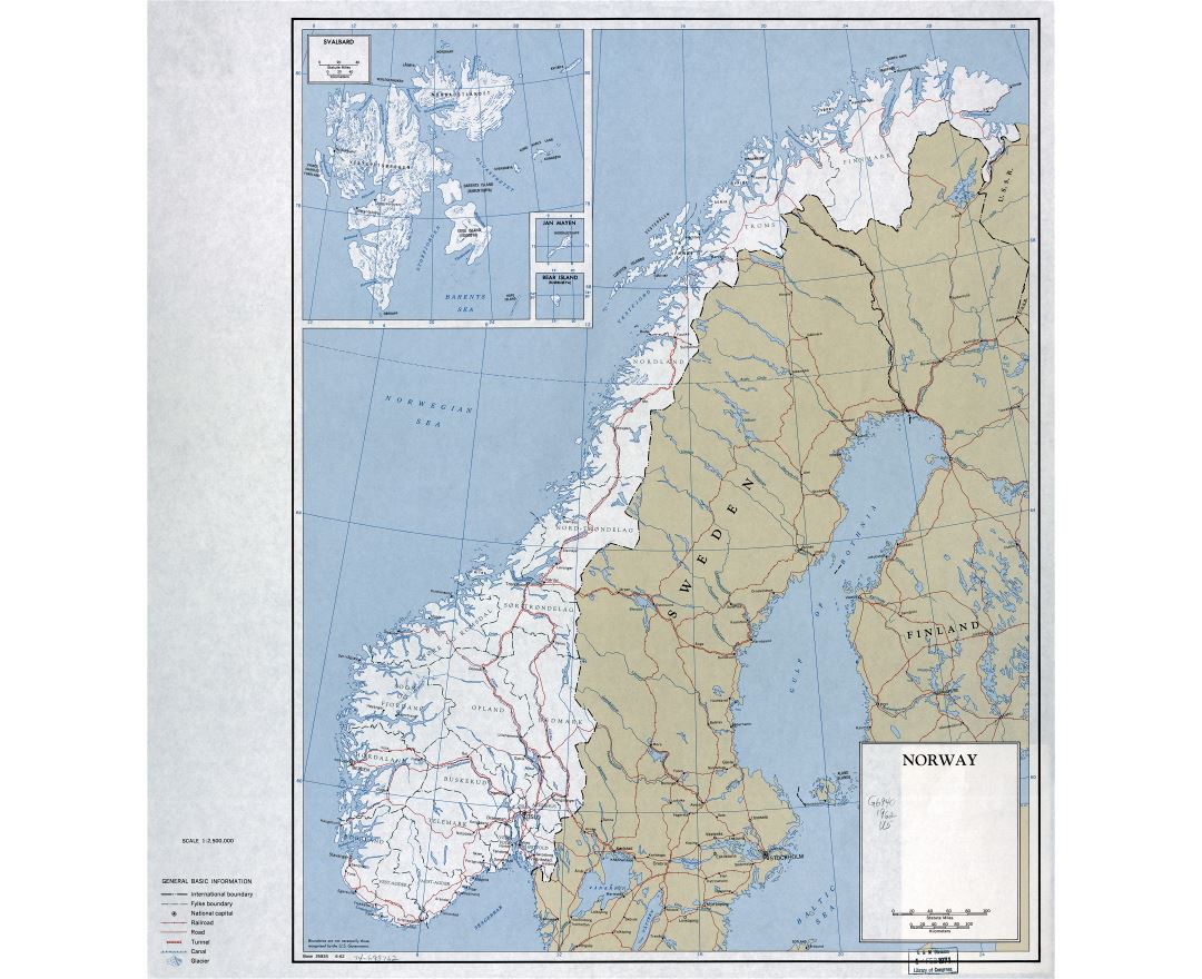 Форма правления — конституционная монархия, форма государственного устройства — унитарная. Король — Харальд V, премьер-министр — Эрна Сульберг. Норвегия подразделяется на 19 фюльке (губерний), которые объединяются в 5 основных неофициальных регионов.