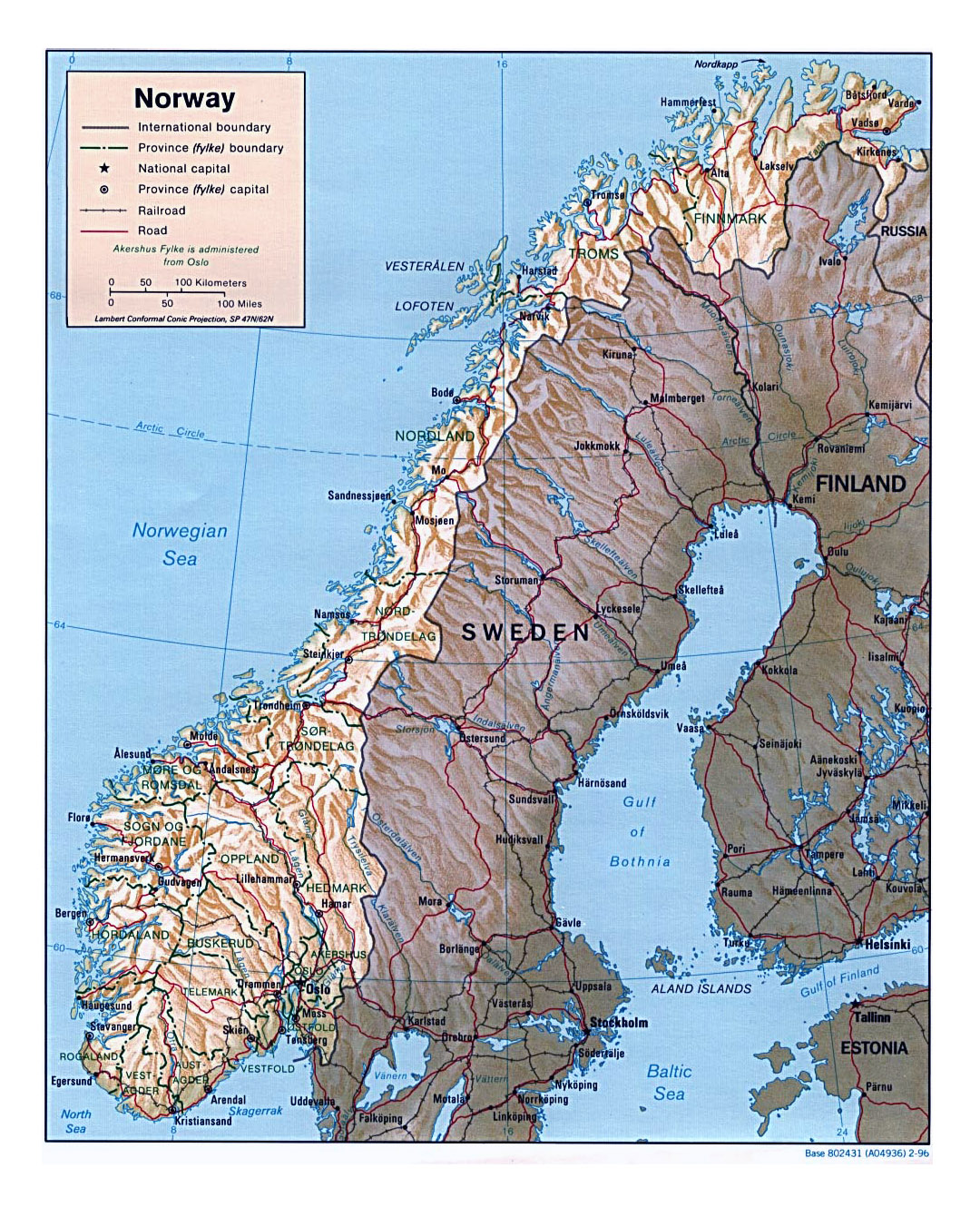 Норвегия - детальная политическая и административная карта с рельефом, дорогами и крупными городами - 1996. Политическая и административная карта Норвегии с рельефом, дорогами и крупными городами.