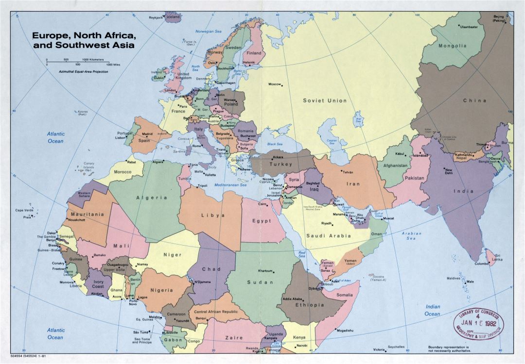 Большая подробная политическая карта Европы, Северной Африки и Юго-Западной Азии - 1981. Карта Европы, Северной Африки и Юго-Западной Азии.