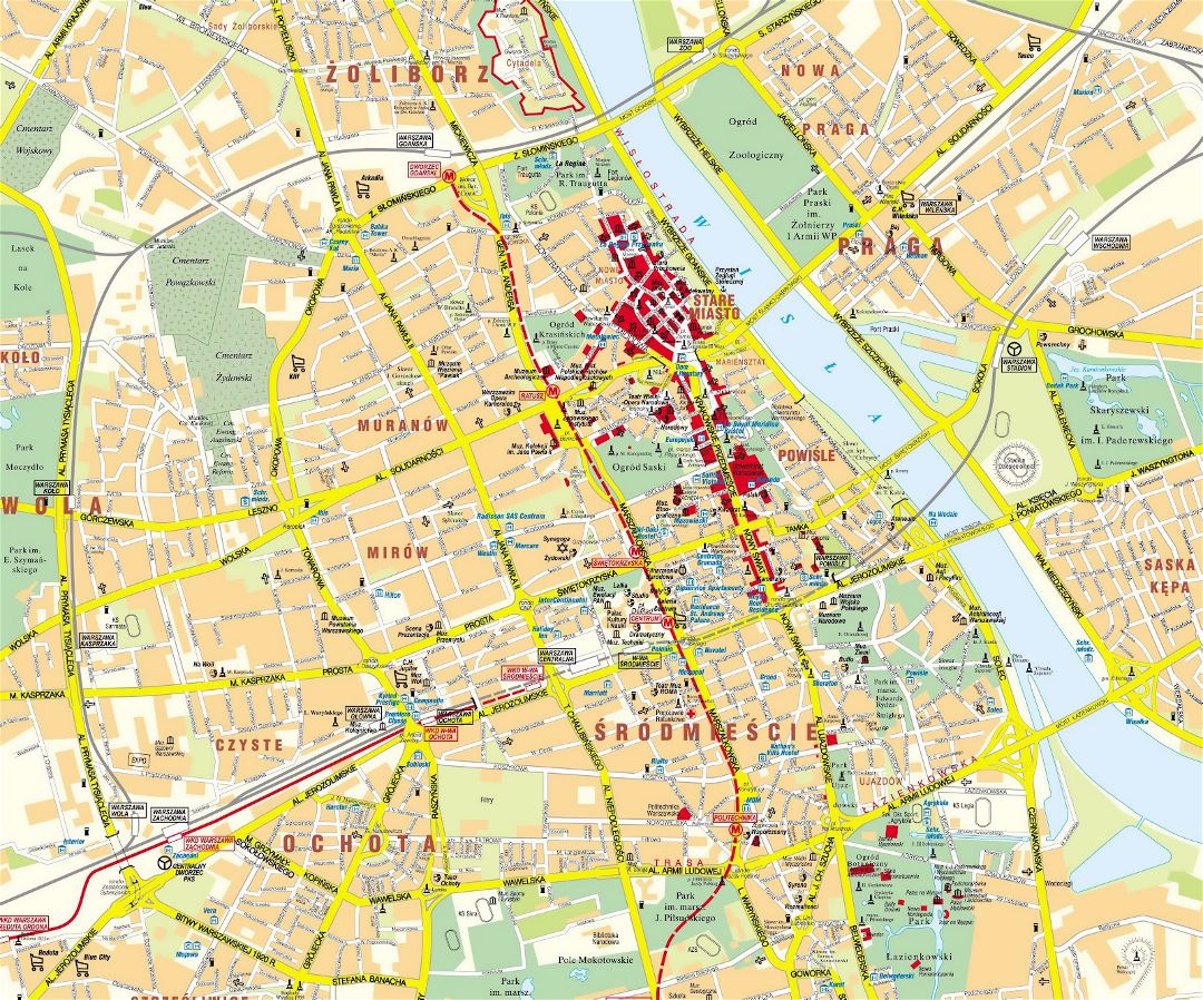 Центральная часть города Варшавы - детальная карта. Детальная карта центральной части города Варшавы.