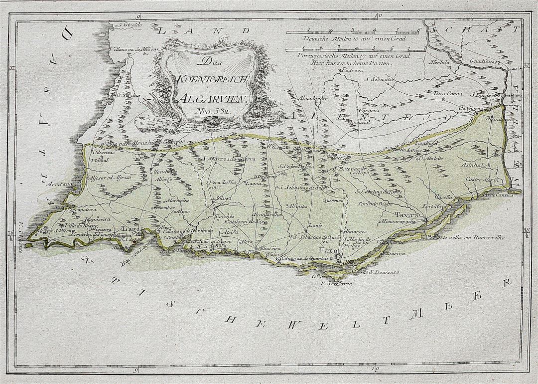 Большая старая карта Алгарве с рельефом и другими пометками - (1730-1774)