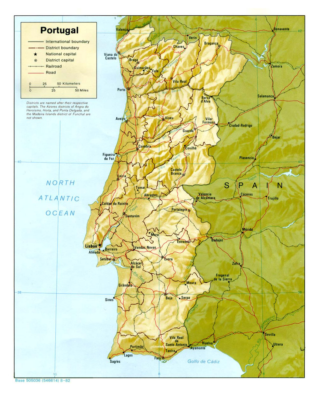 Португалия - детальная политическая и административная карта с рельефом, дорогами и крупными городами - 1982. Политическая и административная карта Португалии с рельефом, дорогами и крупными городами.
