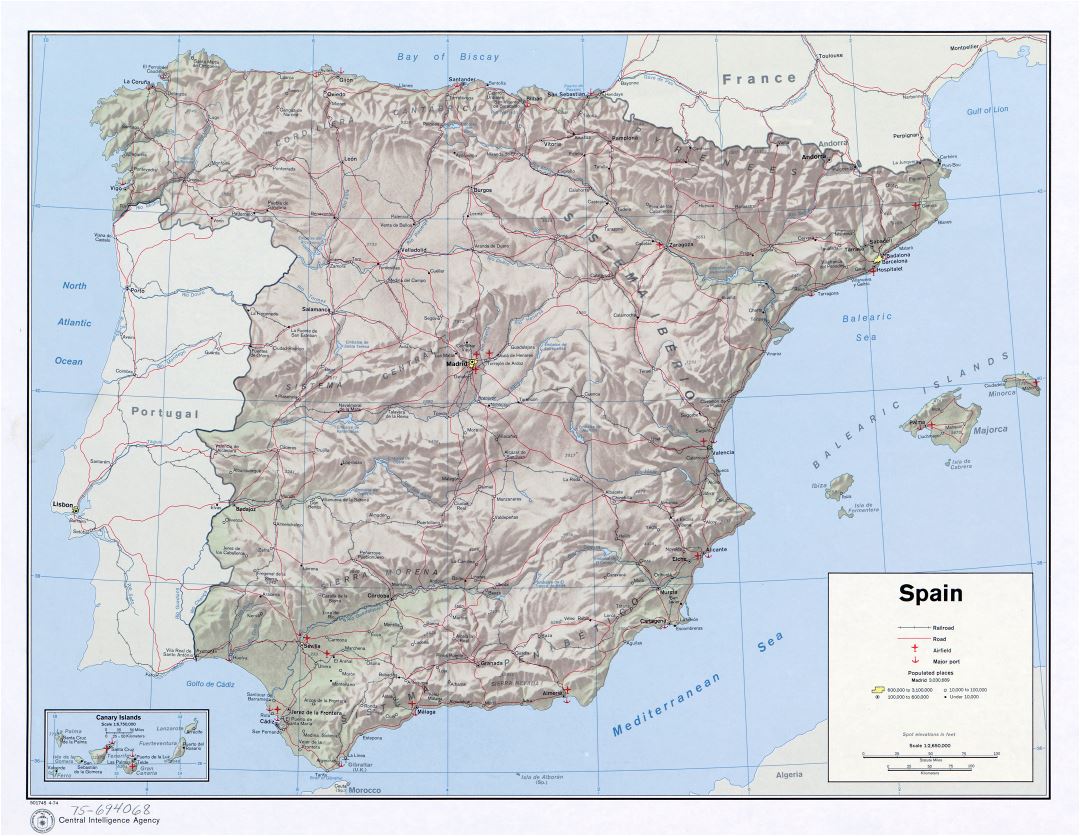Испания - крупномасштабная политическая карта с рельефом, дорогами, железными дорогами, городами, портами и аэропортами - 1974. Политическая карта Испании.