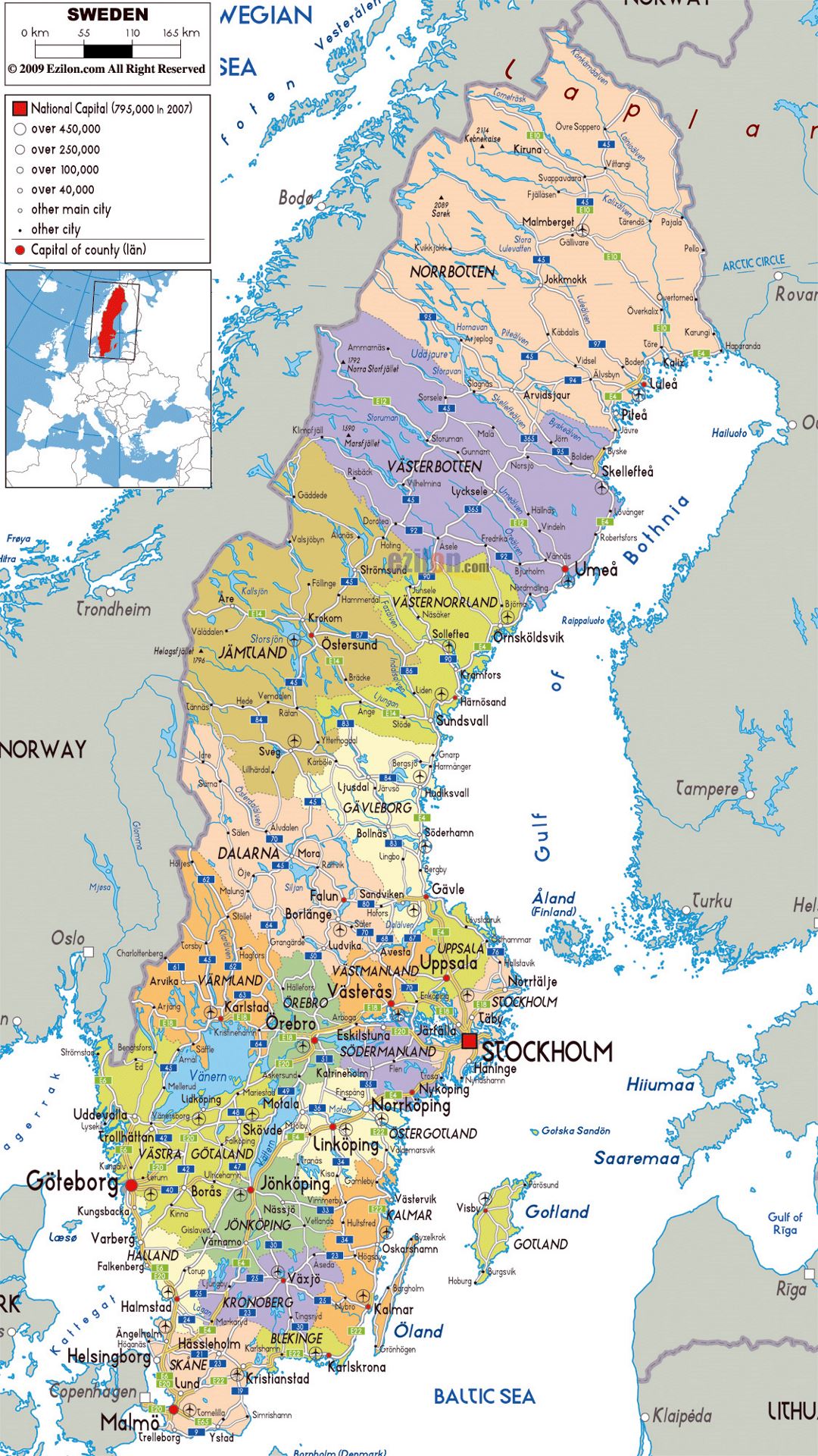 Швеция - большая политическая и административная карта с дорогами, городами и аэропортами. Большая политическая и административная карта Швеции с дорогами, городами и аэропортами.