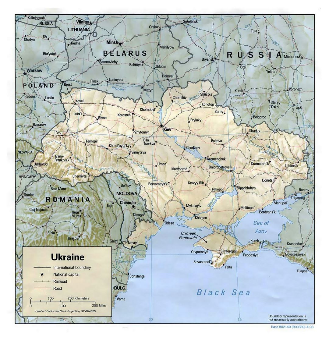Украина - детальная политическая карта Украины с рельефом, дорогами, железными дорогами и крупными городами - 1993. Политическая карта Украины с рельефом, дорогами, железными дорогами и крупными городами.