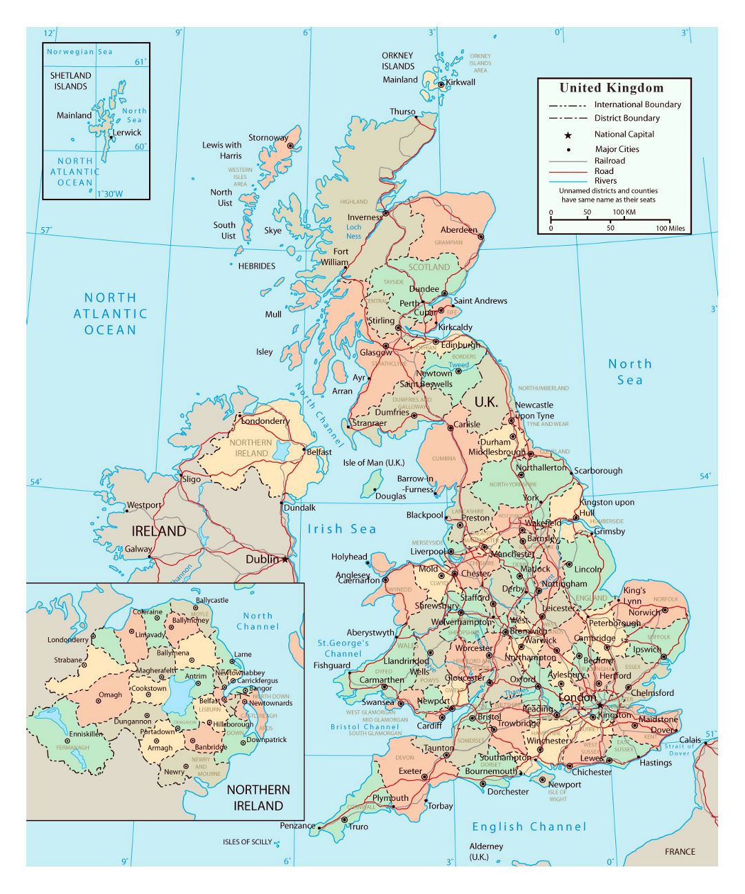 Соединенное Королевство - большая политическая и административная карта с дорогами, железными дорогами и крупными городами. Политическая и административная карта Соединенного Королевства.