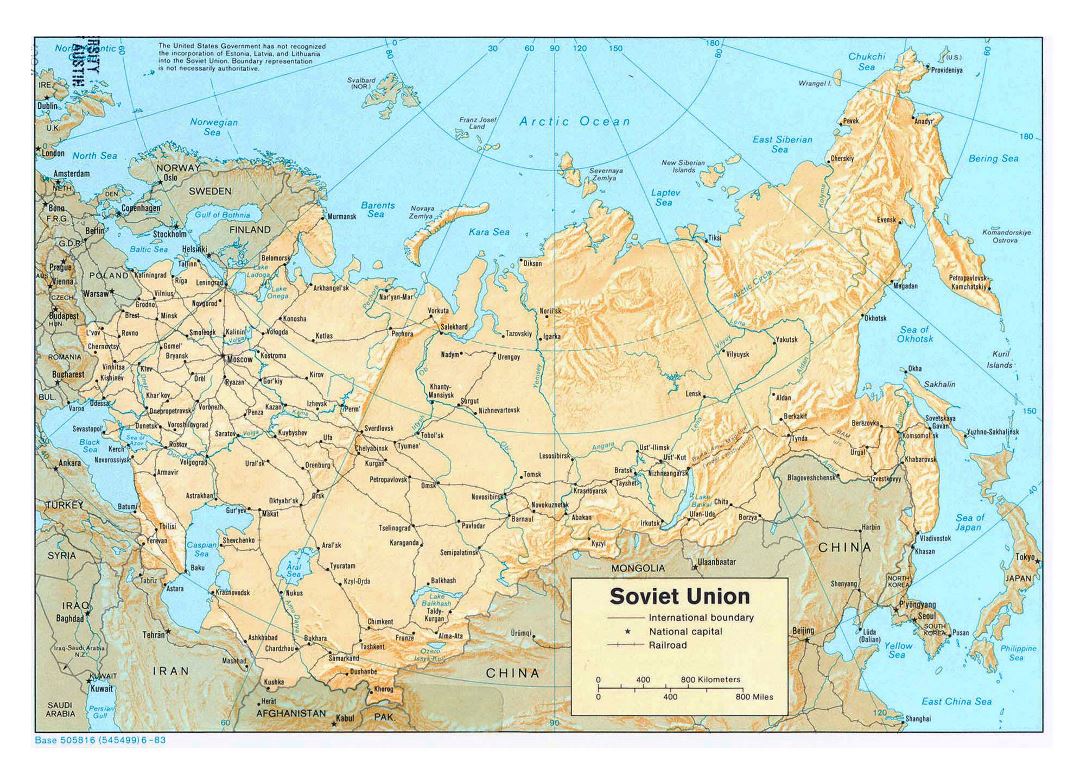 СССР - бльшая политическая карта с рельефом, железными дорогами и крупными городами - 1983. Политическая карта СССР с рельефом.