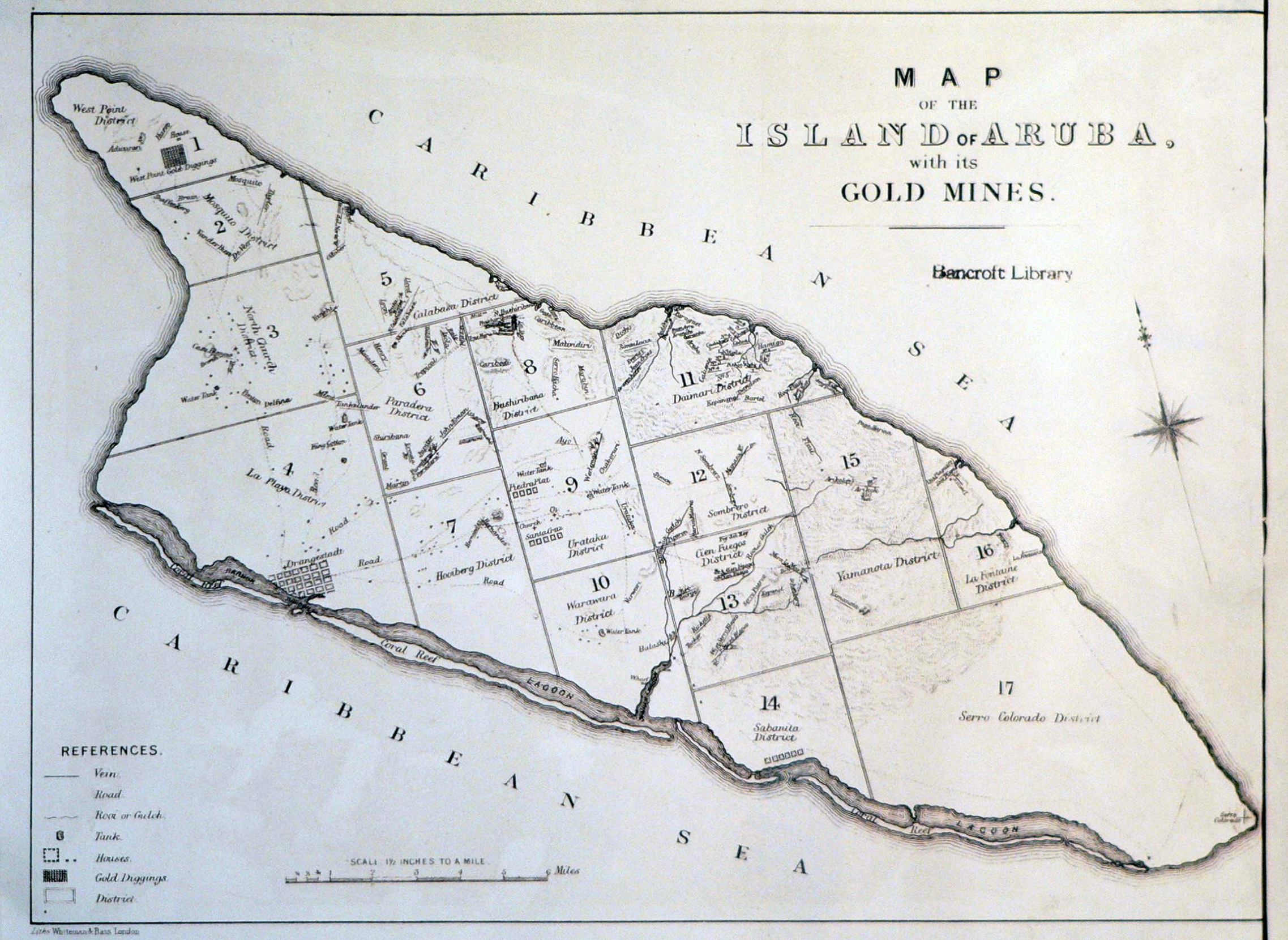 Аруба - большая старая карта острова с его золотыми приисками - 1885. Большая старая карта острова Аруба с его золотыми приисками - 1885.