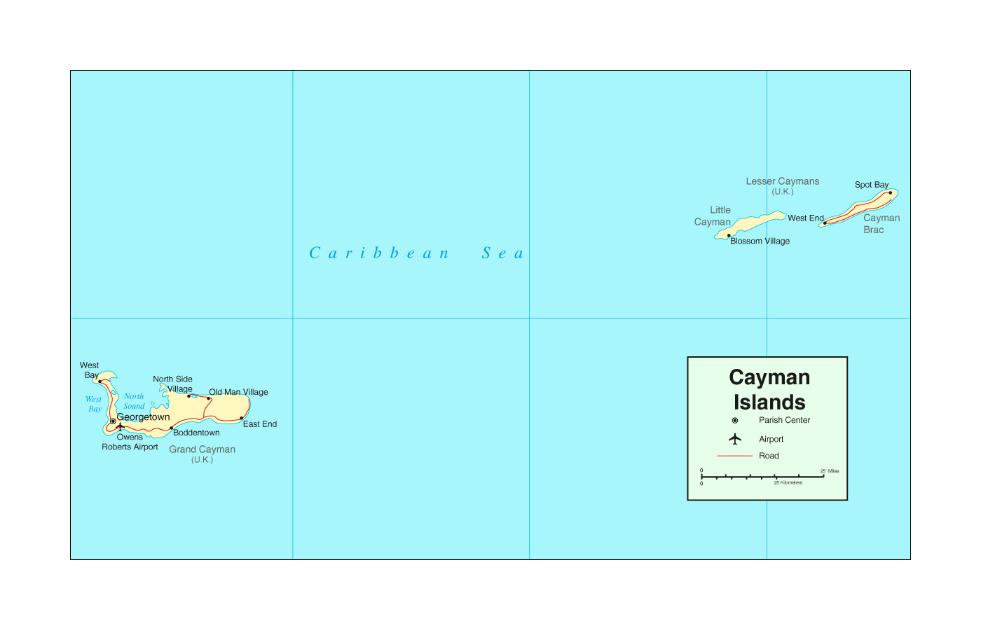 Каймановы острова - подробная политическая карта с дорогами, городами и аэропортами. Подробная политическая карта Каймановых островов с дорогами, городами и аэропортами.