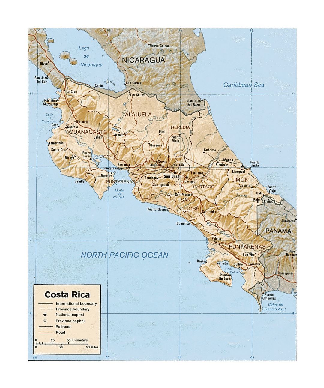 Коста-Рика - детальная политическая и административная карта с рельефом, дорогами, железными дорогами и крупными городами. Детальная политическая и административная карта Коста-Рики с рельефом, дорогами, железными дорогами и крупными городами.