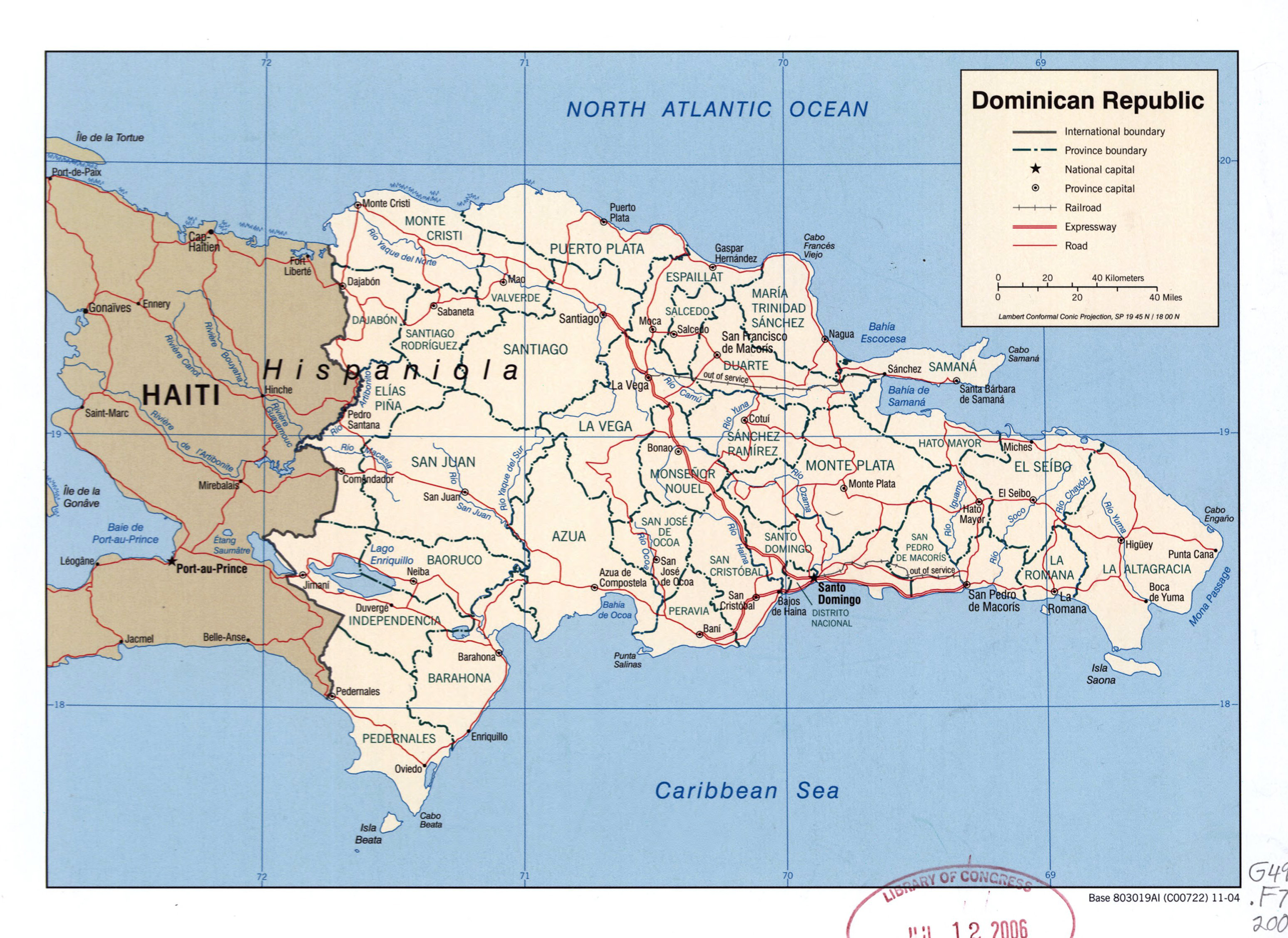 Доминиканская Республика - большая детальная политическая и административная карта с дорогами, железными дорогами и городами - 2004. Политическая и административная карта Доминиканской Республики с дорогами, железными дорогами и городами - 2004.