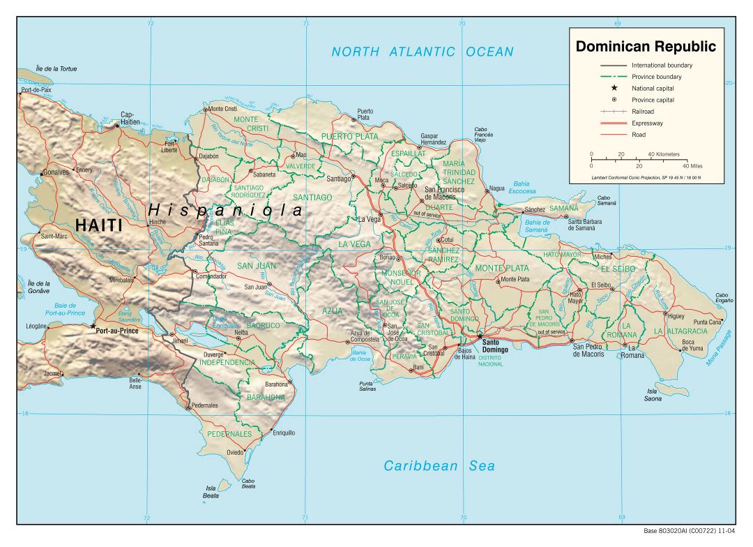 Доминиканская Республика - большая политическая и административная карта с рельефом, дорогами, железными дорогами и крупными городами - 2004. Политическая и административная карта Доминиканской Республики с рельефом, дорогами, железными дорогами и крупными городами.