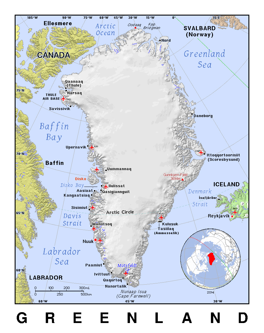 Гренландия - детальная политическая карта с рельефом. Детальная политическая карта Гренландии с рельефом.