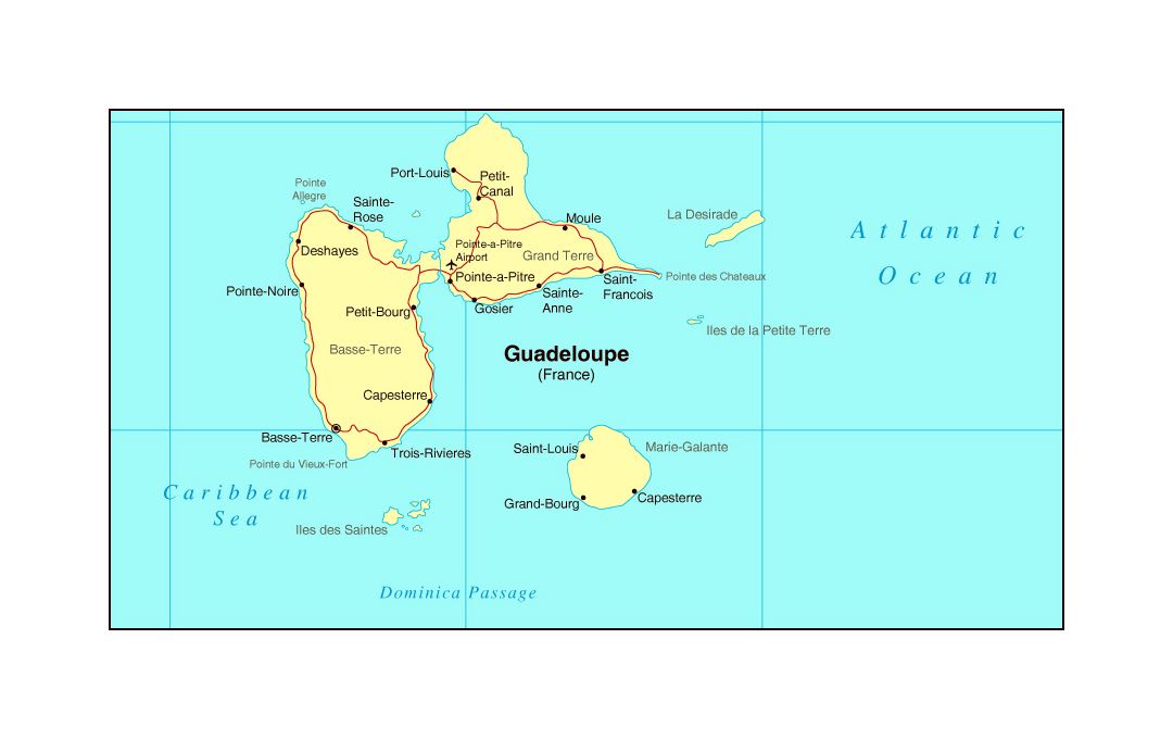 Гваделупа - карта с дорогами, городами и аэропортами. Карта Гваделупы с дорогами, городами и аэропортами.