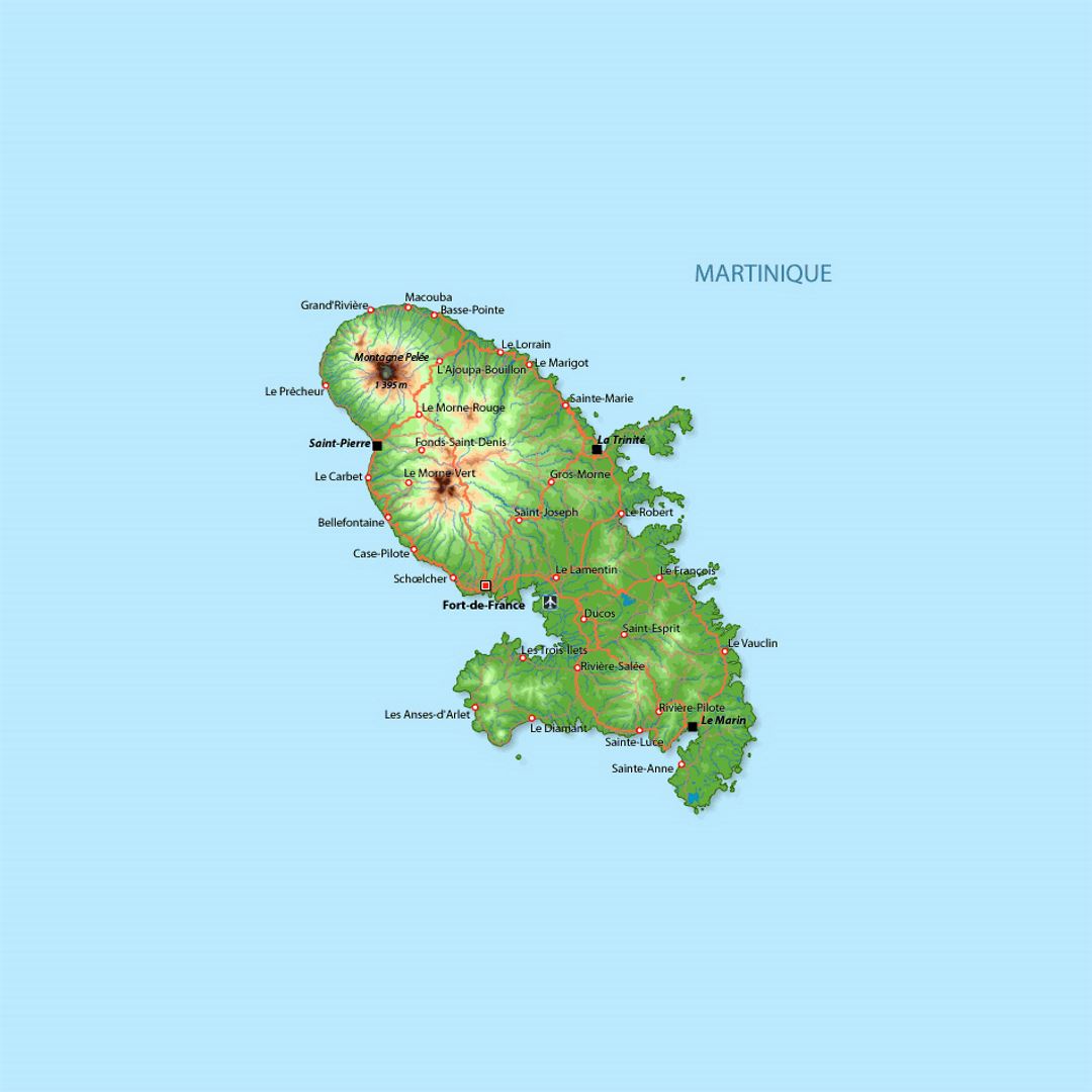 Мартиника - карта высот с дорогами, городами и аэропортами. Карта высот Мартиники с дорогами, городами и аэропортами.