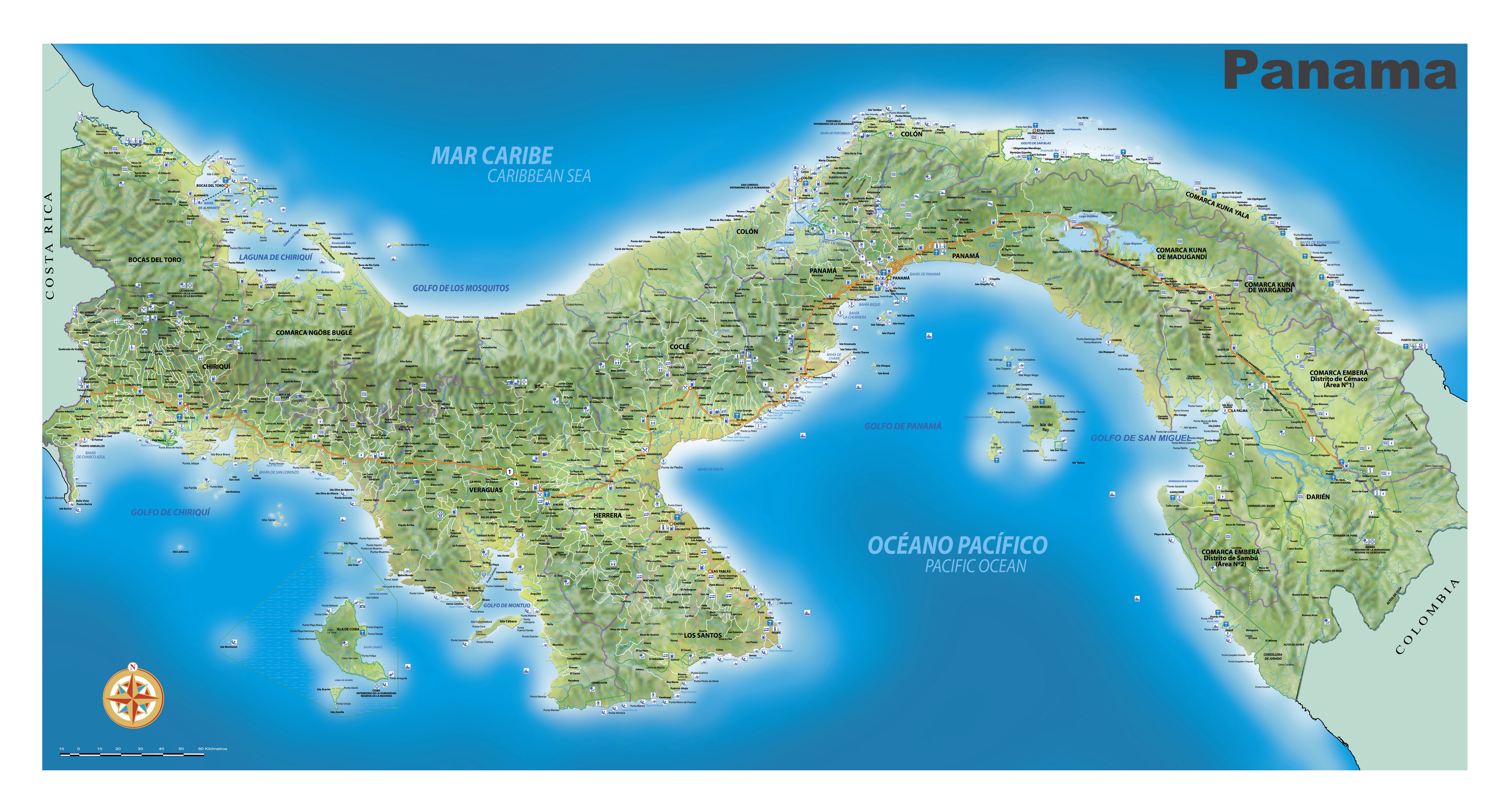 Панама - большая детальная туристическая карта с рельефом, дорогами, городами, портами, аэропортами и другими пометками. Большая детальная туристическая карта Панамы с рельефом, дорогами, городами, портами, аэропортами и другими пометками.