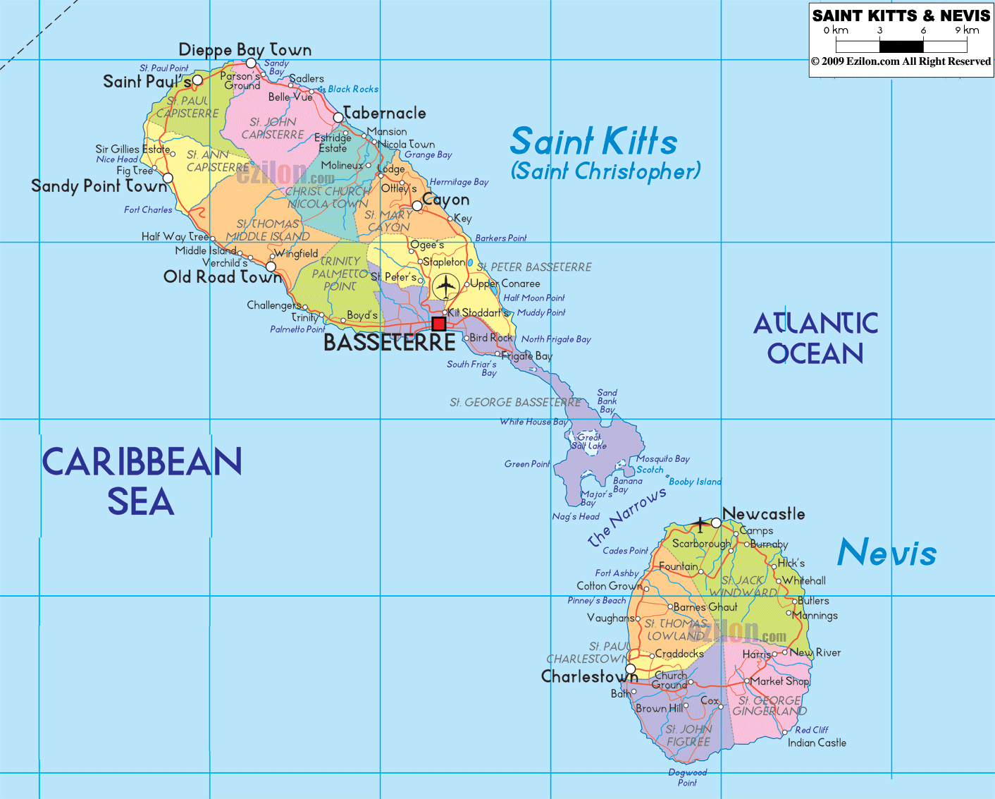 Сент-Китс и Невис - большая политическая и административная карта с дорогами, городами и аэропортами. Большая политическая и административная карта Сент-Китса и Невиса с дорогами, городами и аэропортами.
