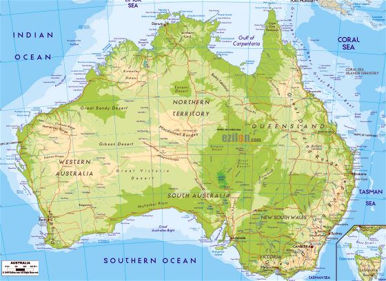 Австралия - большая физическая карта с дорогами, городами и аэропортами. Большая физическая карта Австралии с дорогами, городами и аэропортами.