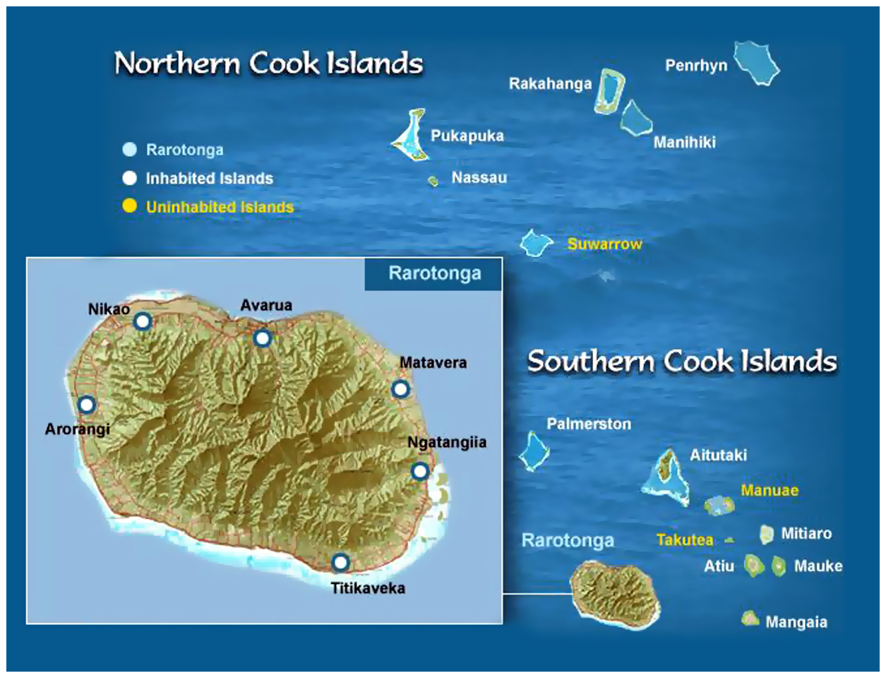 Большая детальная карта Ракаханги, Островов Кука с другими пометками