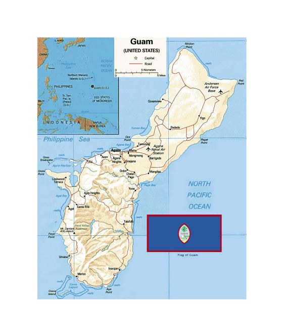Гуам - детальная политическая карта с рельефом, дорогами, городами, аэропортами и флагом. Политическая карта Гуама с рельефом, дорогами, городами, аэропортами и флагом.