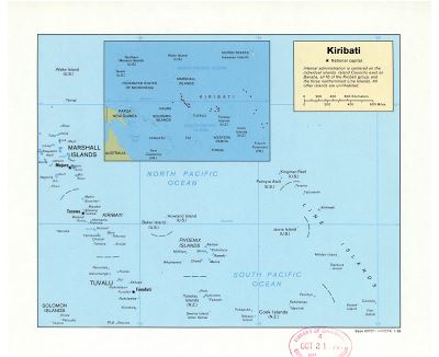 Республика Кирибати — тихоокеанское государство, расположенное в Микронезии и Полинезии. Граничит на северо-западе с водами Маршалловых Островов, Федеративных Штатов Микронезии, на западе и юго-западе — с территориальными водами Науру, Соломоновых Островов и Тувалу, на юге и юго-востоке — с территориальными водами Токелау, островов Кука и Французской Полинезии. На севере и северо-востоке граничит с нейтральными тихоокеанскими водами, а также Внешними малыми островами (США). Протяжённость прибрежной полосы — 1143 км. Исключительная прибрежная экономическая зона (ИЭЗ) — около 3,5 млн км². Территориальные воды — около 22 км от базисной линии. В состав Республики Кирибати входят 33 маленьких атолла, двадцать из которых необитаемы. Из них 16 островов и атоллов в архипелаге Гилберта, остров Банаба (Ошен), 8 островов в архипелаге Феникс и 8 островов в архипелаге Лайн. Общая площадь — 812,34 км². Население Кирибати — 103 058 чел. (2010, перепись). Столица — Южная Тарава (Баирики). Независимость колонии Острова Гилберта от Великобритании была провозглашена 12 июля 1979 года, в этом же году она была официально переименована в Республику Кирибати. В 1983 году вступил в силу договор о дружбе между США и Кирибати, по которому США отказывались от претензий на 14 островов в архипелагах Лайн и Феникс, признав их частью Кирибати.