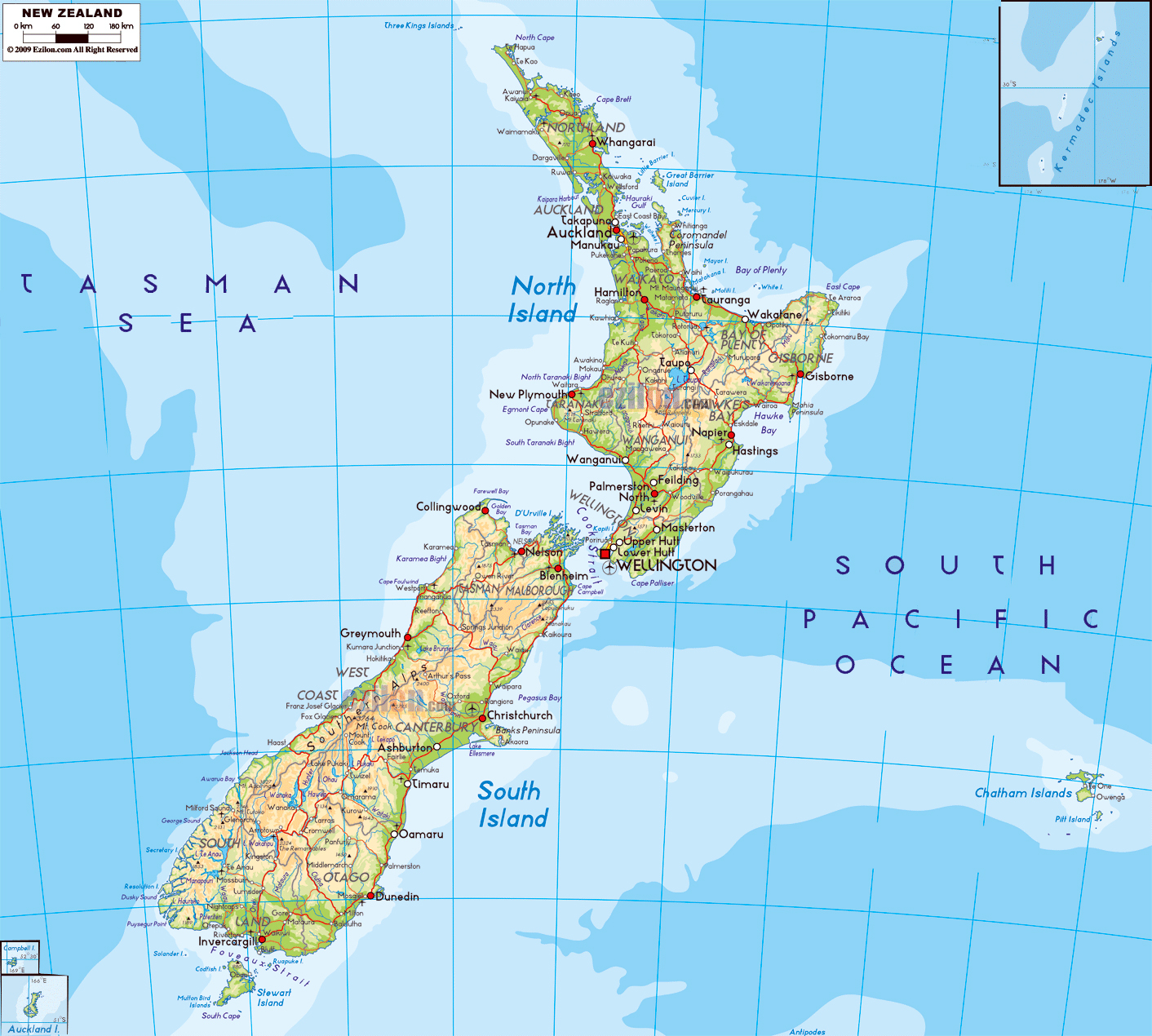 Новая Зеландия - большая физическая карта с дорогами, городами и аэропортами. Большая физическая карта Новой Зеландии с дорогами, городами и аэропортами.