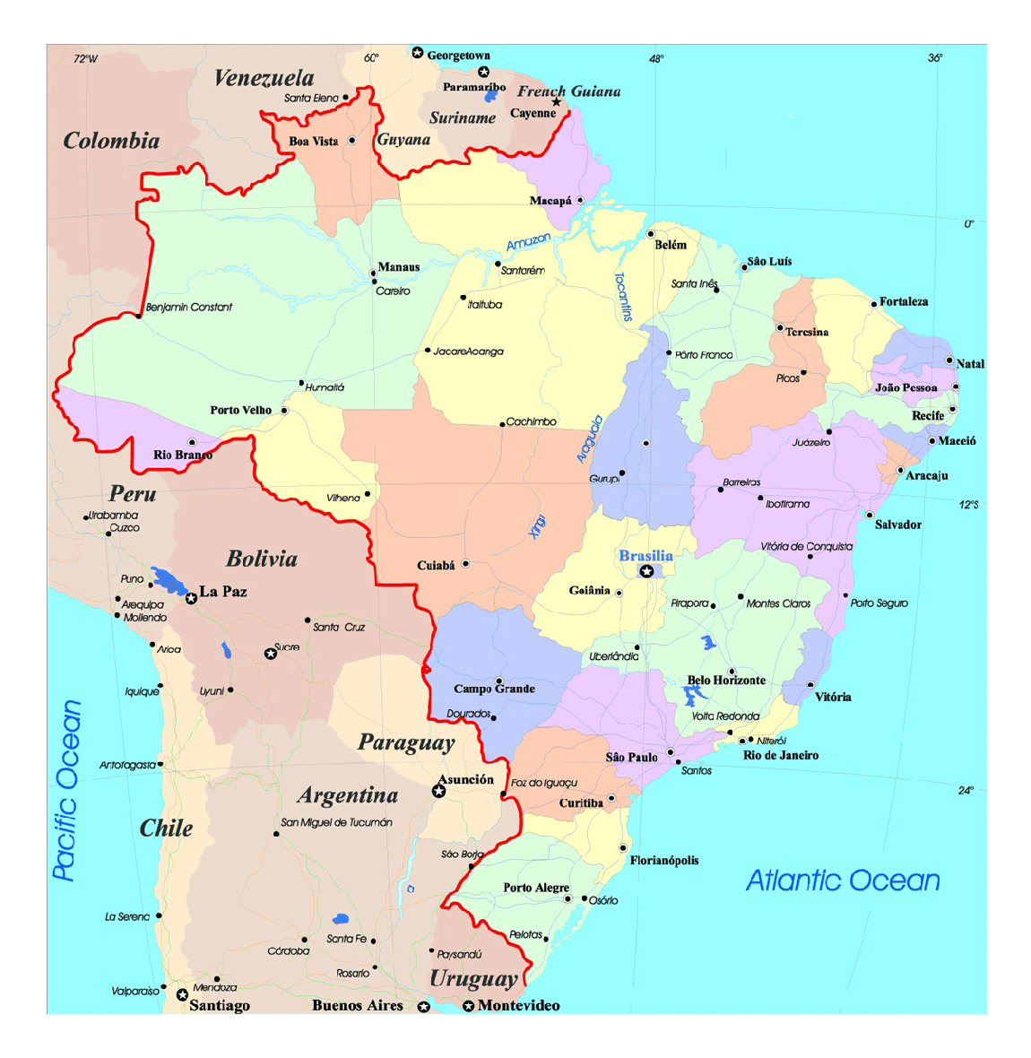 Бразилия - большая политическая и административная карта с дорогами и крупными городами. Политическая и административная карта Бразилии.