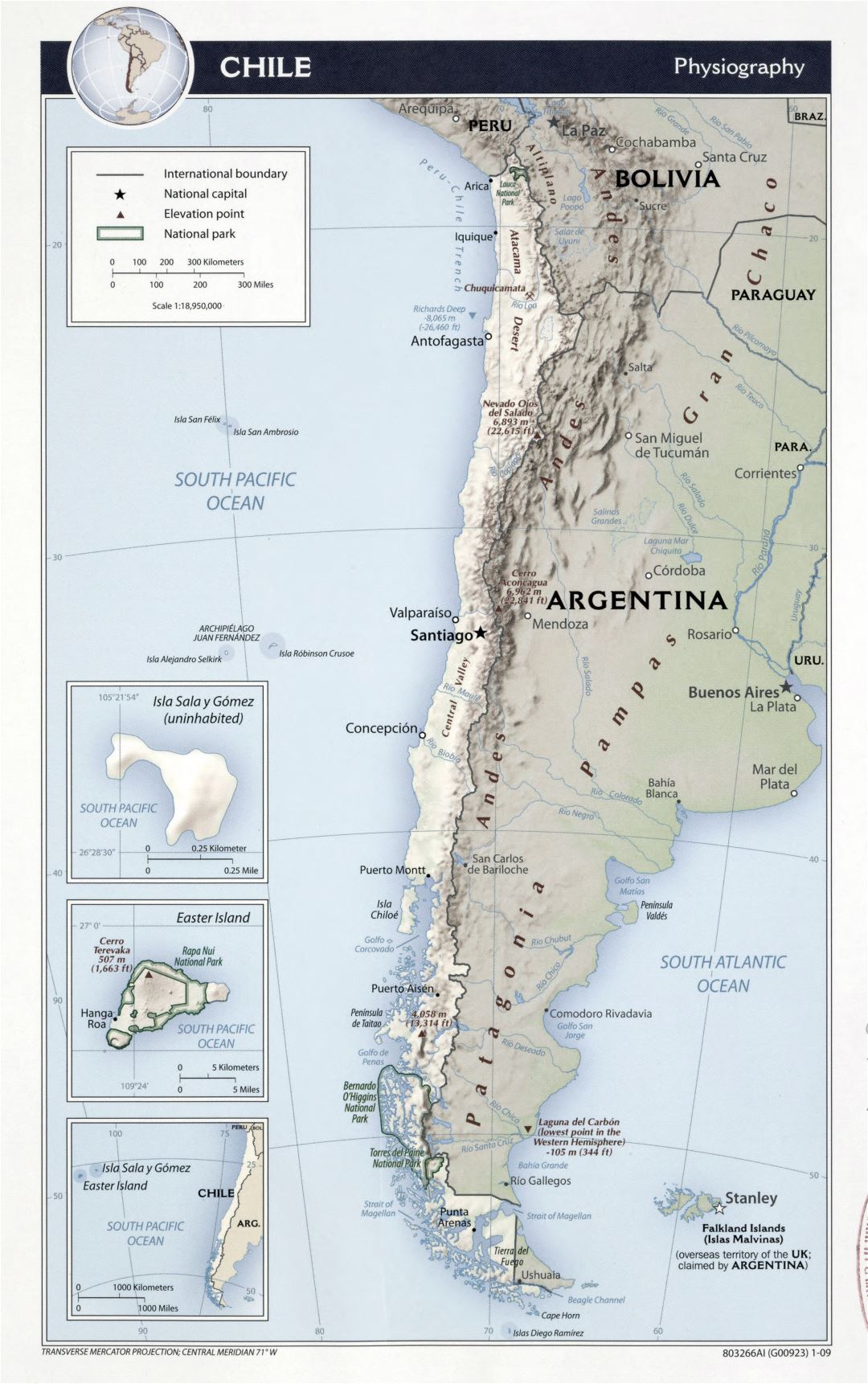 Чили - большая подробная физиографическая карта с другими пометками - 2009. Физиографическая карта Чили с другими пометками - 2009.