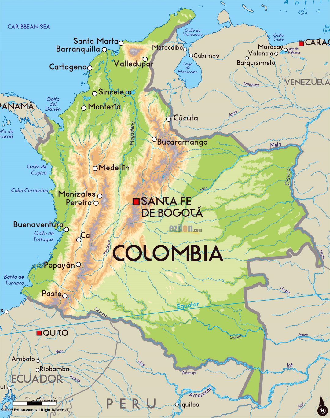 Колумбия - детальная физическая карта с крупными городами. Детальная физическая карта Колумбии с крупными городами.