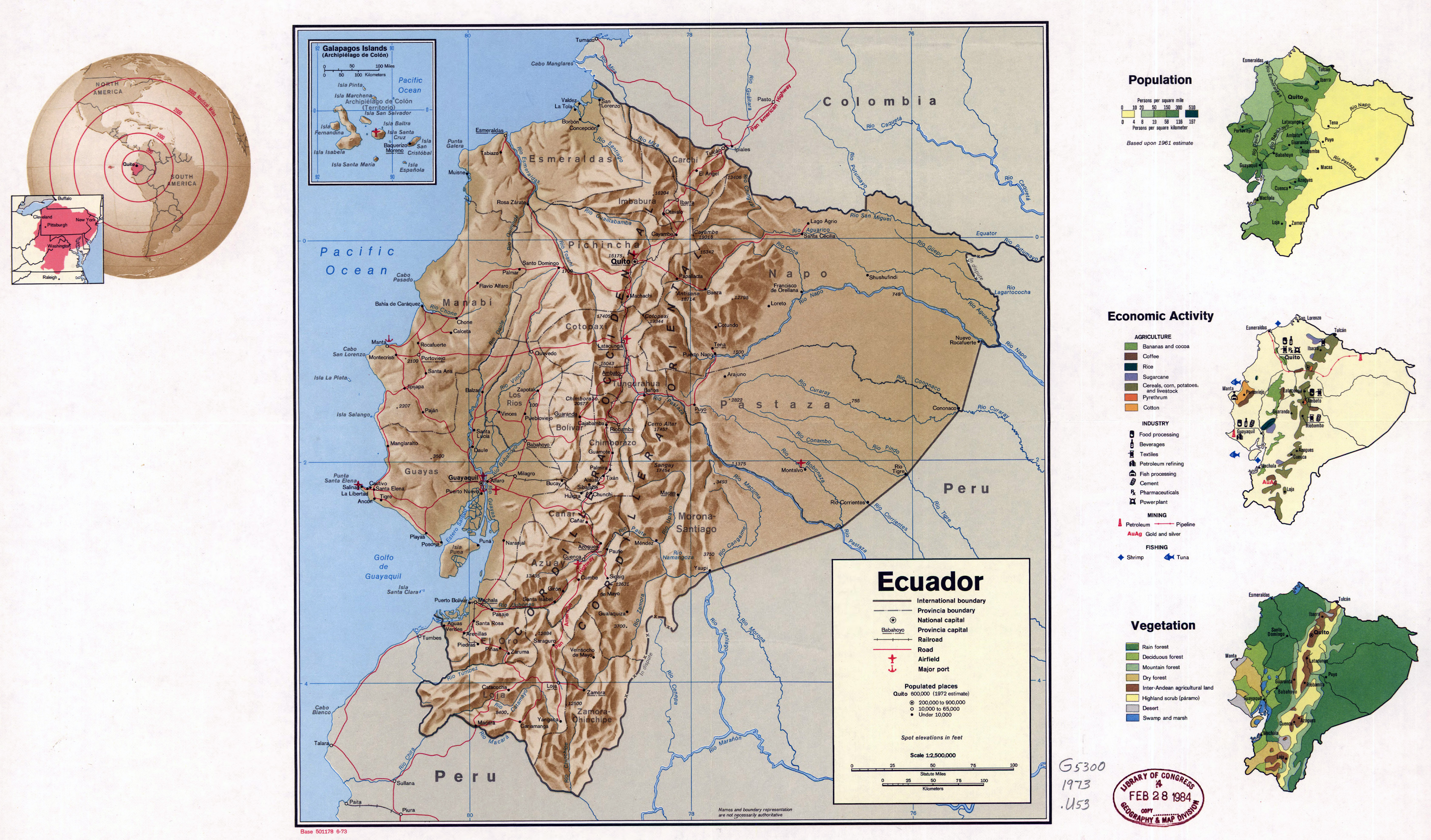 Рельеф, показанный затенением и точечными высотами. Включает в себя вкладку «Галапагосские острова (Archipiélago de Colón)», сравнительную карту местности, карту местности с радиальными расстояниями и тематические карты «Население», «Экономическая активность» и «Растительность».