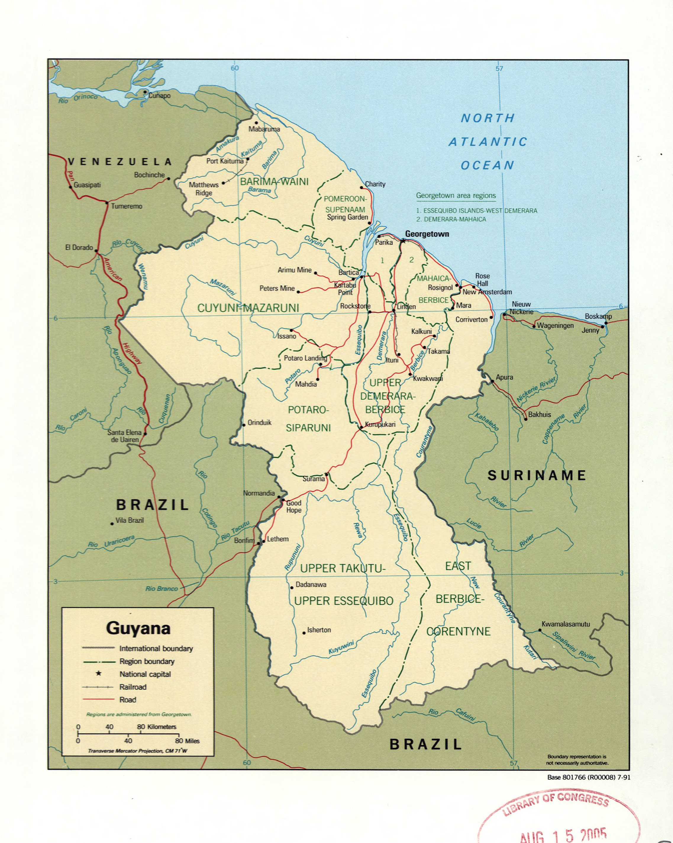 Гайана - большая детальная политическая и административная карта с пометками дорог, железных дорог и крупных городов - 1991. Политическая и административная карта Гайаны.