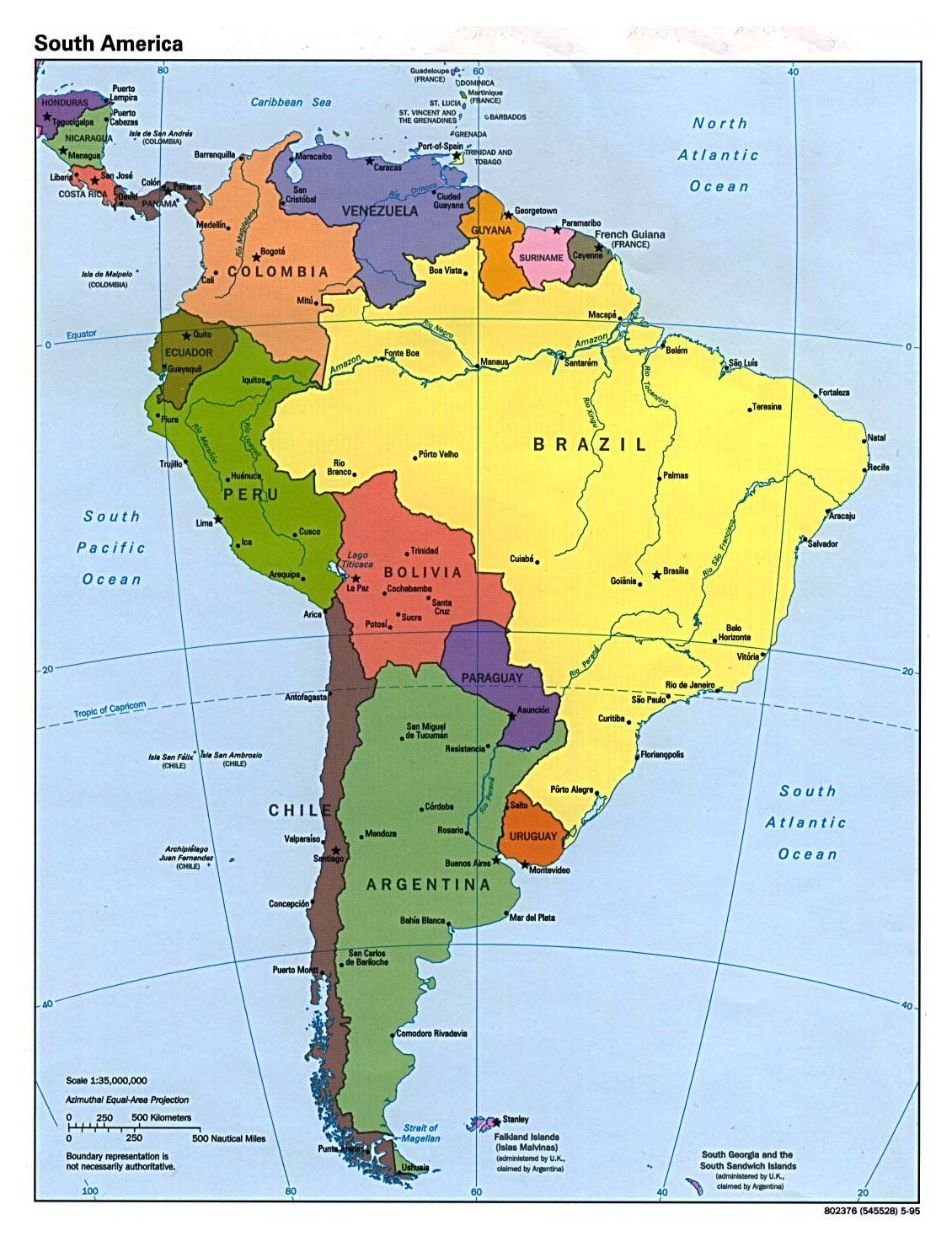 Южная Америка - большая детальная политическая карта. Большая подробная политическая карта Южной Америки - 1995.